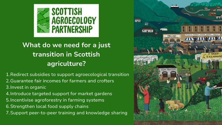 The Scottish Agroecology Partnership (SAP) held a rally outside the Scottish Parliament, calling on the Scottish Government to deliver on that promise of a just transition for agriculture. The SAP is a new and growing alliance of organisations in Scotland – representing more than 3,000 farmers, crofters and landworkers – and was launched at the RHS in June.